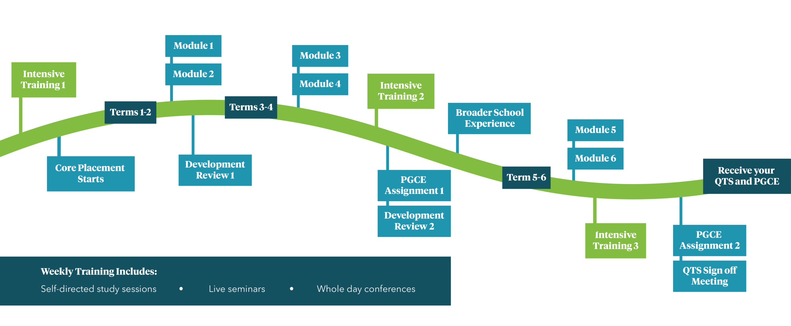 - Intensive training blocks at key points in the year, alongside weekly professional studies